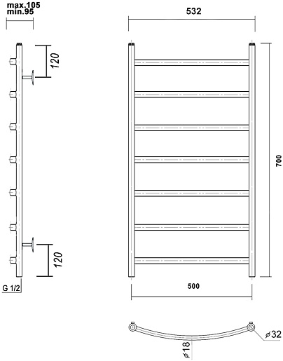 Комплектация: полотенцесушитель, крепление телескопическое (4 шт.), заглушка, кран Маевского, угловой переходник (2 шт.).