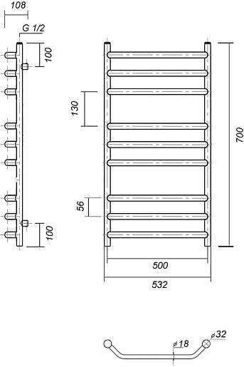 - Диаметр боковых труб: 32 мм.
