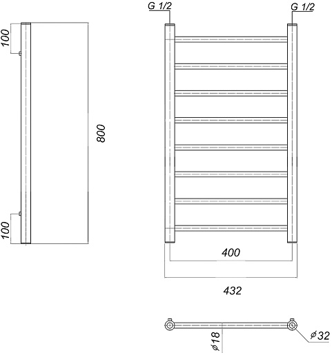 Комплектация: полотенцесушитель, крепление телескопическое (4 шт.), заглушка, кран Маевского, угловой переходник (2 шт.).