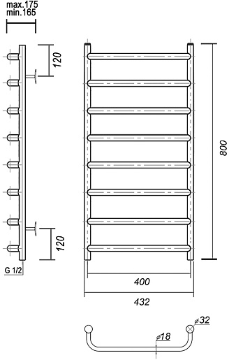 Комплектация: полотенцесушитель, крепление телескопическое (4 шт.), заглушка, кран Маевского, угловой переходник (2 шт.).