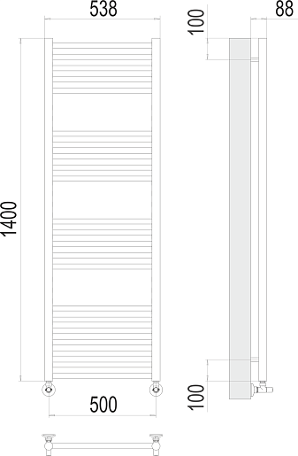 Комплектация: полотенцесушитель, вентиль 3/4x1/2 ГШ (2 шт.), эксцентрик 3/4x1/2 (2 шт.), отражатель 3/4 (2 шт.), крепеж.
