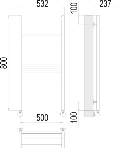 Комплектация: полотенцесушитель, уголок со сгоном 3/4х1/2 Г/Ш (2 шт.), эксцентрик (2 шт.), отражатель (2 штуки), крепеж.