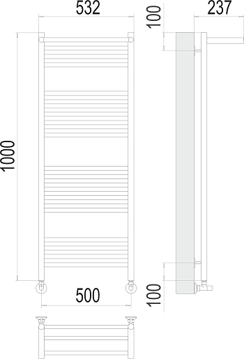 Комплектация: полотенцесушитель, уголок со сгоном 3/4х1/2 Г/Ш (2 шт.), эксцентрик (2 шт.), отражатель (2 штуки), крепеж.