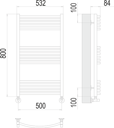 Комплектация: полотенцесушитель, уголок со сгоном 3/4х1/2 Г/Ш (2 шт.), эксцентрик (2 шт.), отражатель (2 штуки), крепеж.