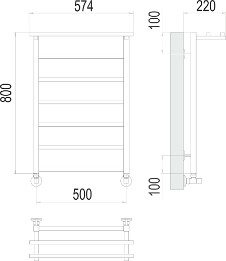 Комплектация: полотенцесушитель, уголок со сгоном 3/4х1/2 Г/Ш (2 шт.), эксцентрик (2 шт.), отражатель (2 штуки), крепеж.