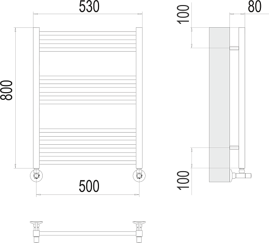 Комплектация: полотенцесушитель, вентиль угловой квадратный 3/4x1/2 ГШ (2 шт.), эксцентрик (2 шт.), отражатель (2 шт.), крепеж.