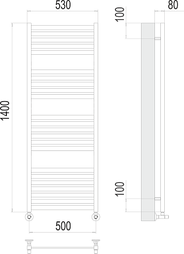 Комплектация: полотенцесушитель, вентиль угловой квадратный 3/4x1/2 ГШ (2 шт.), эксцентрик (2 шт.), отражатель (2 шт.), крепеж.