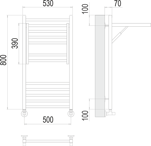 Комплектация: полотенцесушитель, уголок со сгоном 3/4х1/2 Г/Ш (2 шт.), эксцентрик (2 шт.), отражатель (2 штуки), крепеж.