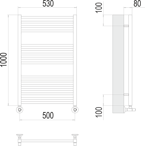 Комплектация: полотенцесушитель, вентиль угловой квадратный 3/4x1/2 ГШ (2 шт.), эксцентрик (2 шт.), отражатель (2 шт.), крепеж.