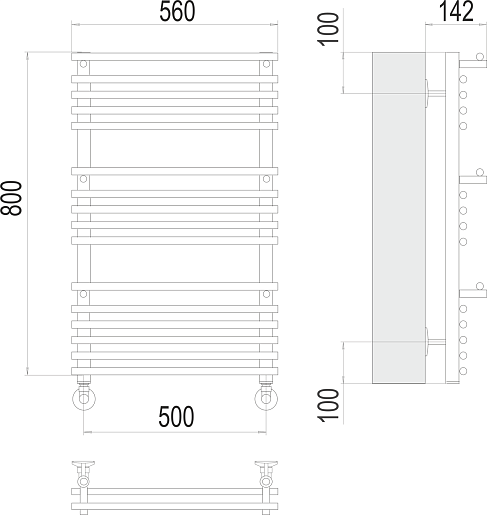 Комплектация: полотенцесушитель, уголок со сгоном 3/4х1/2 Г/Ш (2 шт.), эксцентрик (2 шт.), отражатель (2 штуки), крепеж.