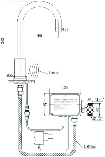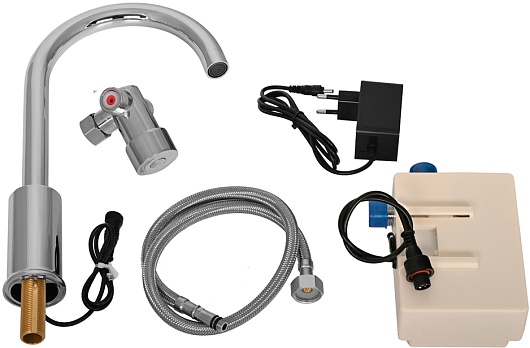 В комплекте: смеситель, блок питания, регулятор подачи воды, комплект подводки.