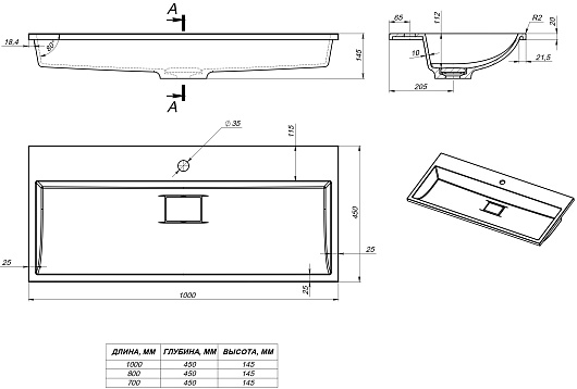 - Размер (ШxДxВ):1000 x 450 x 145 мм.