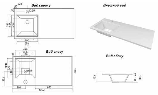 - Одно отверстие под смеситель по центру чаши. Подходит к стиральным машинам глубиной до 470 мм.