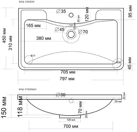 - Размер (ШxГxВ): 797x450x150 мм.