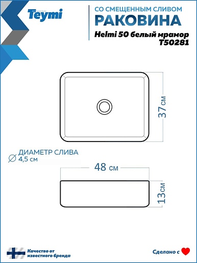 Накладная раковина Teymi Helmi 50 белый мрамор - арт. T50281.