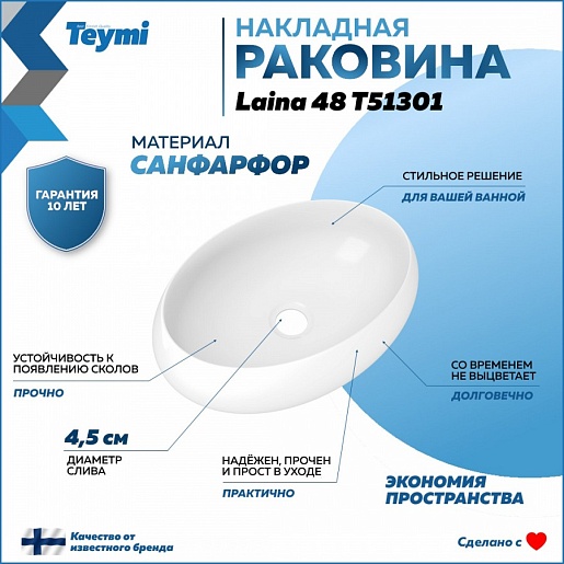Teymi Раковина накладная в ванную Laina 48 глянцевая белая T51301