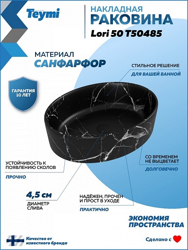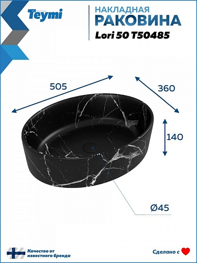 Teymi Раковина накладная в ванную Lori 50 мрамор чёрный матовый T50485