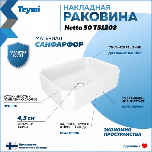 Teymi Раковина накладная в ванную Netta 50/37 глянцевый белый T51202