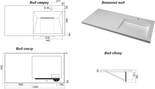 - Размер (ШxГxВ): 1200x550x180 мм.