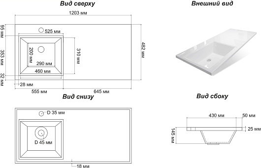 - Размер (ШxГxВ): 1203x482x145 мм.