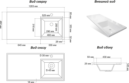 - Размер (ШxГxВ): 1203x482x145 мм.