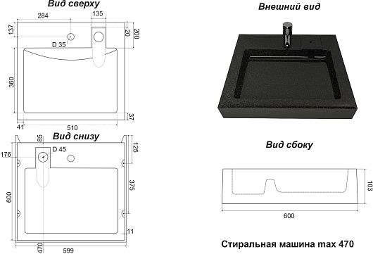 Stella Polare Раковина под стиральную машину Солярис 60х60 черный металлик