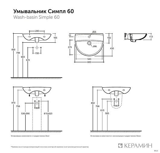 Керамин Раковина подвесная/на пьедестал Симпл 60 4810531138488