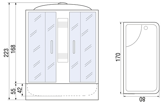 Душевая кабина River Nara 170/80/55 МТ прямоугольной формы понравится тем, кто не любит тесноту. Её габариты составляют 170х80х218 сантиметров, поэтому в ней можно не только принимать душ, но и проводить полноценные водные процедуры. Высоты поддона вкупе с длиной кабинки достаточно для комфортного отдыха, для максимальной релаксации предусмотрены сиденье, подголовник и полочка для косметических средств и принадлежностей.