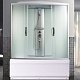 Раздвижные двери кабины изготовлены из прочного матового стекла толщиной 0,4 сантиметра. Задняя стенка выполнена из того же стекла белого цвета. м, снижающим скольжение даже во влажном состоянии.- крыша