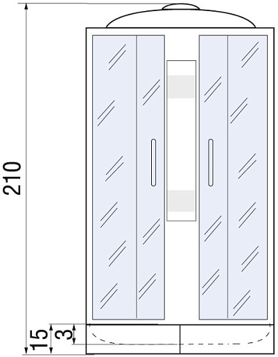Две раздвижные двери сделаны из высокопрочного матового стекла. Материал легко поддается чистке и не царапается в процессе использования. Душевая кабина оформлена в белом цвете. Такое решение дизайнеров позволяет вписать изделие в любой интерьер. Центральная панель оборудована ручным душем, а монтаж выполняется по современной технологии без применения силикона.