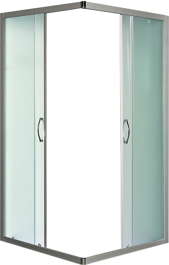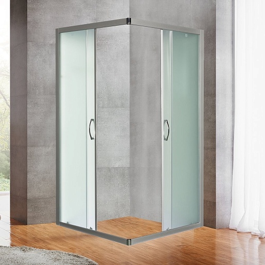 Стенки уголка – неподвижные, для входа предусмотрено наличие двух симметричных раздвижных дверец с плавным ходом. Стекло матовое, полупрозрачное. В конструкции нет поддона, что станет преимуществом для тех, кому неудобно переступать через высокий порог.