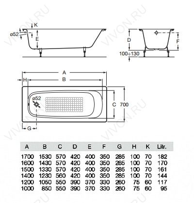 Roca Ванна чугунная Continental 21290300R 150x70 см, без антискользящего покрытия