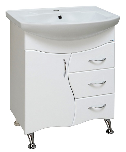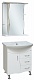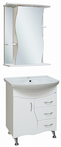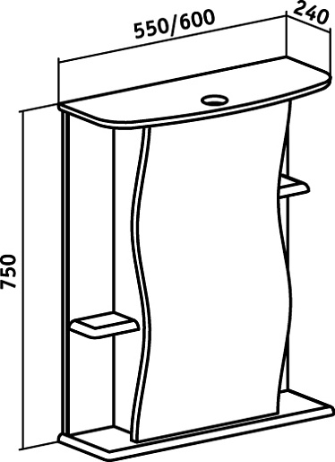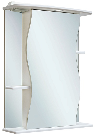 Описание: влагостойкая, зеркальная, распашная дверца с волнообразными боковыми кромками, Слева и справа от нее расположены открытые полки. В карниз зеркального шкафа встроены розетка, подсветка и выключатель.