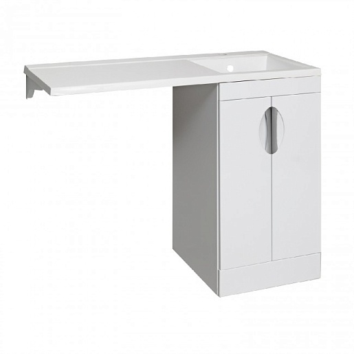 Комплект предусматривает установку стиральной машины под крылом умывальника слева от тумбы.