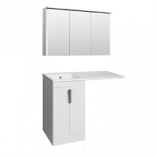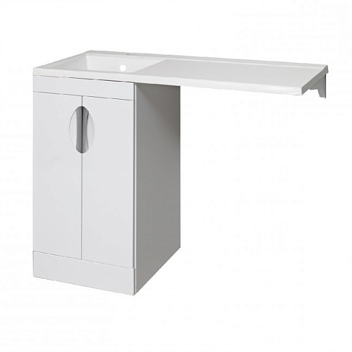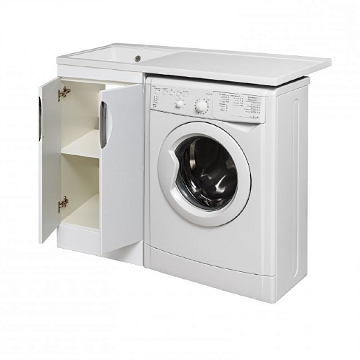 Комплект предусматривает установку стиральной машины под крылом умывальника справа от тумбы.