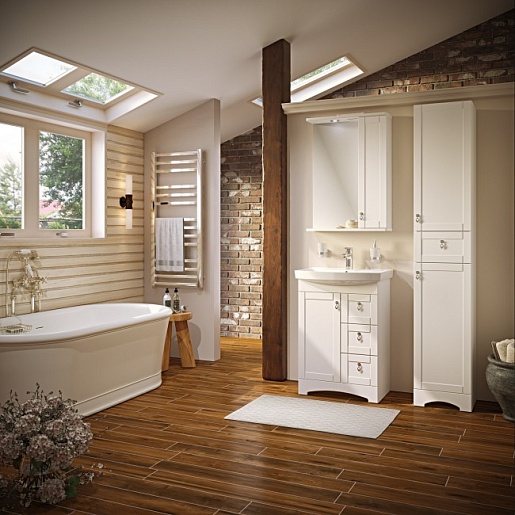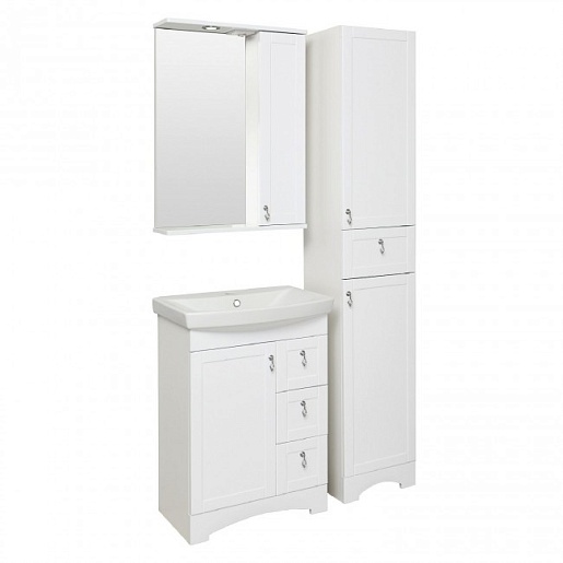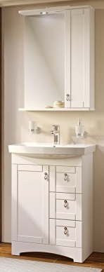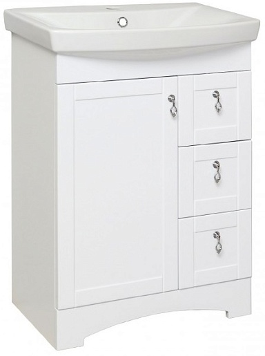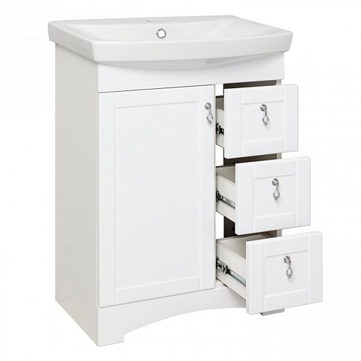 - Тумба под раковину Мерида 60: Тумба напольная с одним распашным фасадом и тремя выдвижными ящиками. За левой дверкой - одна внутренняя полка. Ящики - на шариковых направляющих полного выдвижения, петли со встроенным доводчиком, ручки - 4 шт, ножки пластик - 4 шт (скрыты за нижней фальш-панелью).