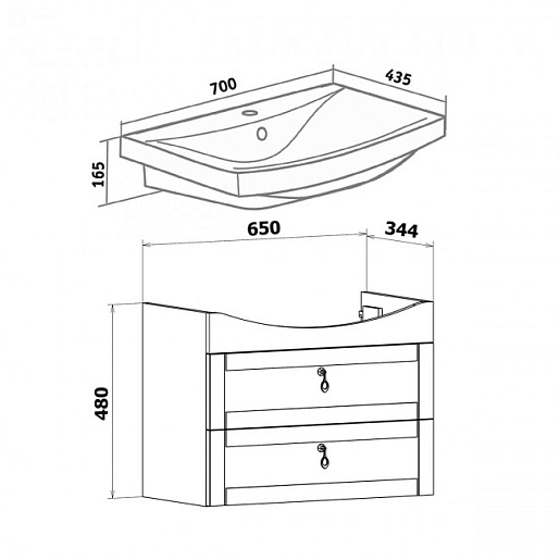 - Тумба под раковину Мерида 70: Тумба подвесная с двумя выдвижными ящиками на шариковых направляющих полного выдвижения, ручки - 2 шт., навесы -2 шт.
