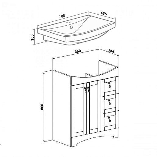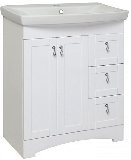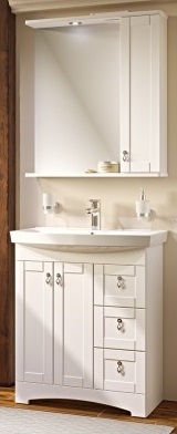 - Тумба под раковину Мерида 70: Тумба напольная с двумя распашными фасадами и тремя выдвижными ящиками. За дверками - одна внутренняя полка. Ящики - на шариковых направляющих полного выдвижения, петли со встроенным доводчиком, ручки - 5 шт, ножки пластик - 4 шт (скрыты за нижней фальш-панелью).