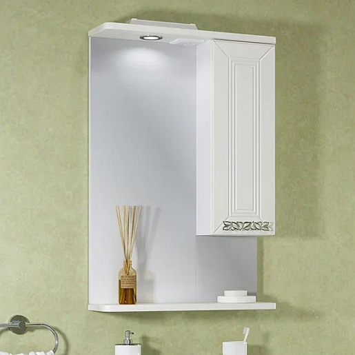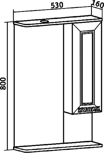 - Зеркало Монро 53: Зеркальный шкаф оборудован одним врезным светодиодным светильником 220В и розеткой с выключателем. Справа - шкафчик с распашной дверцей и одной внутренней полкой. Под зеркалом - нижняя полка. Петли со встроенным доводчиком, ручка - 1 шт.