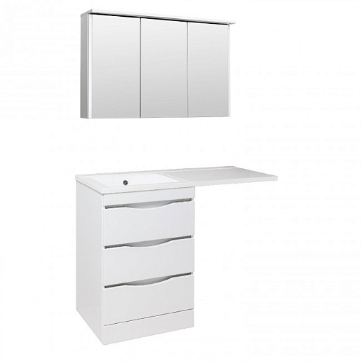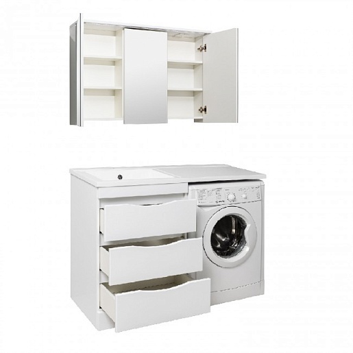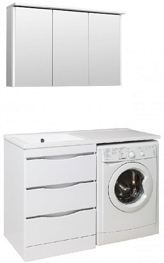 Комплект предусматривает установку стиральной машины под крылом умывальника справа от тумбы.