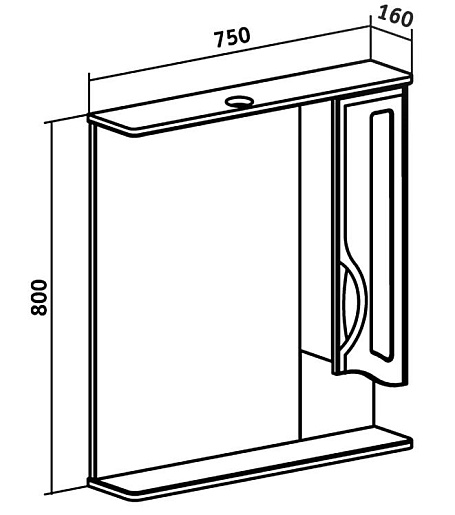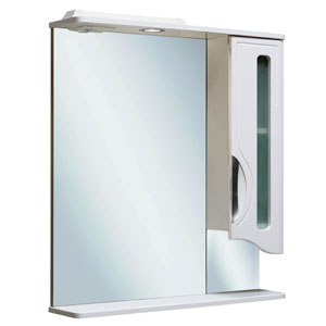 Описание: Зеркало с козырьком и нижней полкой, закрытое отделение сбоку (справа), петли со встроенным доводчиком. Дверца со стеклянной вставкой. Один светильник, трансформатор мощностью 60 Вт, розетка с выключателем.