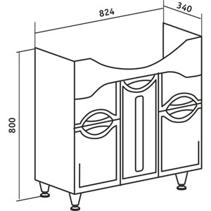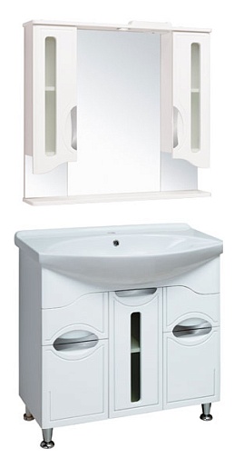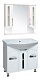 Описание: Зеркало с козырьком и нижней полкой, два закрытых отделения, петли со встроенным доводчиком. Дверцы со стеклянной вставкой. Один светильник, трансформатор мощностью 60 Вт, розетка с выключателем.