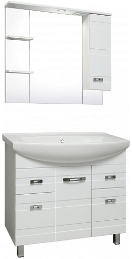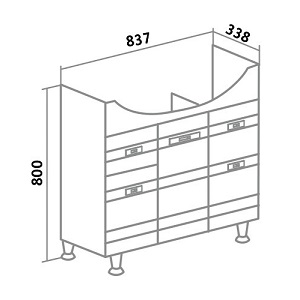 Описание: Тумба под умывальник на ножках с тремя распашными дверцами и двумя боковыми выдвижными ящиками. За центральной дверкой -одна внутренняя полка. Петли со встроенным доводчиком, ящики на шариковых направляющих полного выдвижения, ручки — 5шт, ножки хром — 2шт, ножки пластик — 2шт.