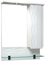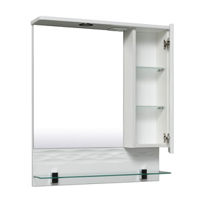 Описание: Зеркальный шкаф оборудован светодиодным светильником и блоком розетка/выключатель. Справа — шкафчик с распашной дверцей и двумя внутренними стеклянными полками. Под зеркалом — открытая стеклянная полка на 2-х хромированных полкодержателях. Выпускается только в правом исполнении.