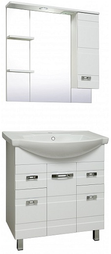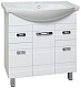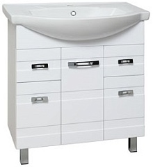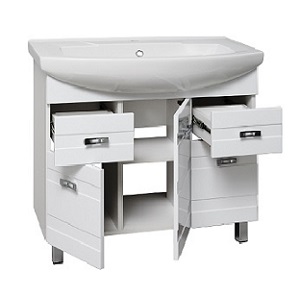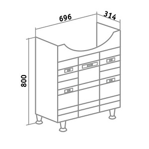 - Тумба под умывальник на ножках с тремя распашными дверцами и двумя боковыми выдвижными ящиками. За центральной дверкой одна внутренняя полка. Петли со встроенным доводчиком, ящики на шариковых направляющих полного выдвижения, ручки (5 шт.), ножки хром (2 шт.), ножки пластик - (2 шт.).