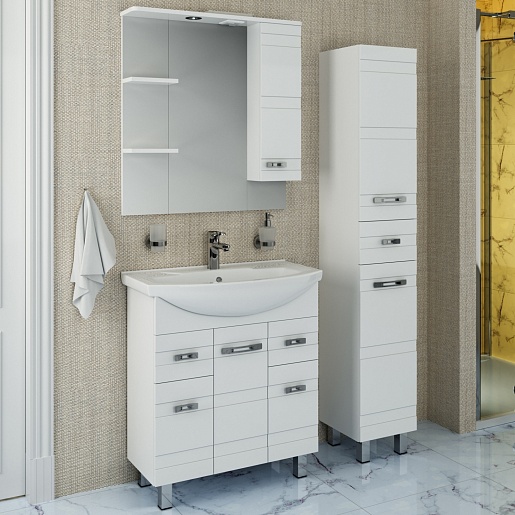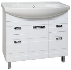 - Тумба под умывальник на ножках с тремя распашными дверцами и двумя боковыми выдвижными ящиками. За центральной дверкой -одна внутренняя полка. Петли со встроенным доводчиком, ящики на шариковых направляющих полного выдвижения, ручки — 5шт, ножки хром — 2шт, ножки пластик — 2шт.