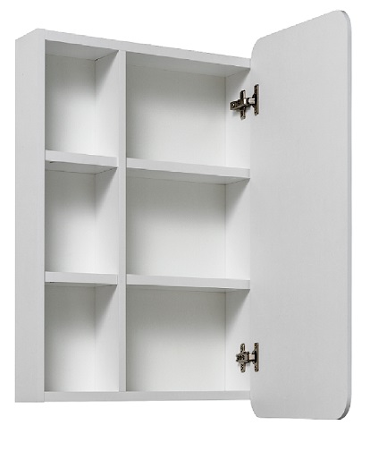 - Зеркальный шкаф без подсветки с одной распашной дверкой и открытыми полками (слева или справа, зависит от установки).