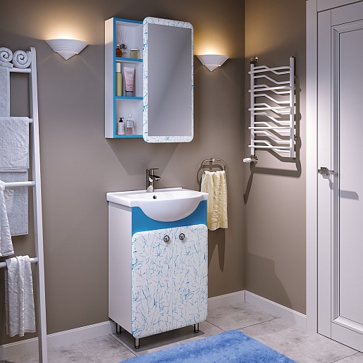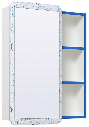 Описание: Зеркальный шкаф без подсветки с одной распашной дверкой и открытыми полками (слева или справа, зависит от установки). Внутри шкафа две внутренние полки. Петли со встроенным доводчиком.