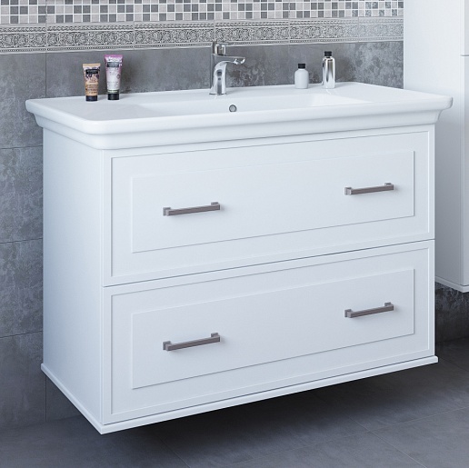 - Тумба под раковину Модена 105: выдвижные фасады, доводчики, фурнитура-состаренное серебро