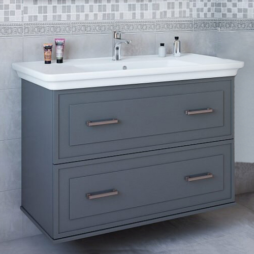 - Тумба под раковину Модена 105: выдвижные фасады, доводчики, фурнитура-состаренное серебро